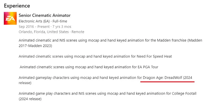 Auf der LinkedIn-Seite von EAs Senior Cinematic Animator Kevin Scott steht, dass die Veröffentlichung von Dragon Age: Dreadwolf für 2024 geplant ist.