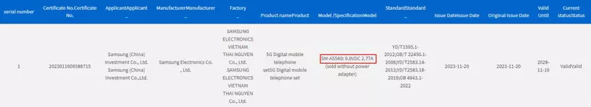 In den Unterlagen taucht das Galaxy A55 5G mit der Modellnummer SM-A5560 auf. Das Smartphone wird mit einer 25W-Schnellladeunterstützung kommen. Genau die gleiche Aufladung hat übrigens auch das aktuelle Galaxy A54 5G Smartphone.