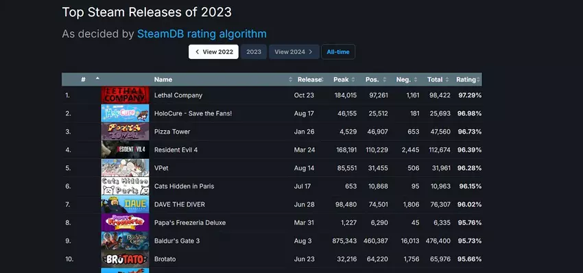 Laut den SteamDB-Statistiken erhielt das kooperative Horrorspiel Lethal Company die höchsten Bewertungen von den Spielern. Das Spiel, das von einem einzigen Entwickler unter dem Spitznamen Zeekerss entwickelt wurde, hat 97,28 % positive Bewertungen (in Steam - 98 %), während zum Beispiel Baldur's Gate III 95,73 % hat.