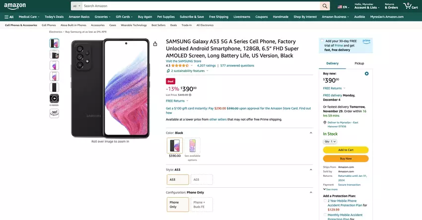 Wir sprechen über das Modell Galaxy A53 5G. Das Gerät kann jetzt auf Amazon für check price on amazon gekauft werden. Es ist nur in der Farbe Schwarz und in einer Variante mit 128 GB Speicherplatz erhältlich.