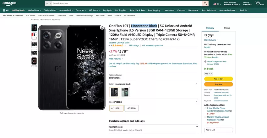 Es handelt sich um das Modell OnePlus 10T in der Version 8/128 GB und der Farbe Moonstone Black. Das Smartphone kostet check price on amazon- check price on amazon.