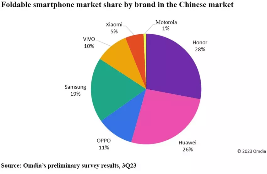Marktführer auf dem chinesischen Markt ist Honor mit einem Anteil von 28 %. Das Unternehmen verkaufte 1,7 Millionen Geräte. Ein wichtiger Erfolgsfaktor war das Modell Magic V2, auf das ein Viertel der Verkäufe im dritten Quartal 2023 entfiel.