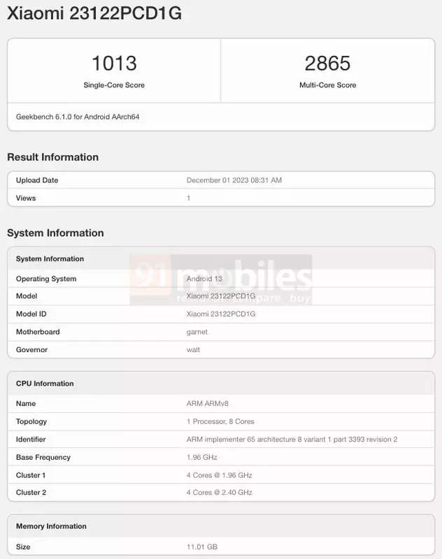 Die Neuheit läuft unter der Modellnummer 23122PCD1G. Laut der Publikation 91mobiles handelt es sich um das Modell POCO X6. Dem Bericht zufolge wird das Smartphone von einem Snapdragon 7s Gen 2 Prozessor angetrieben werden. Der Chip kommt mit einer Frequenz von 2,4 GHz und Adreno 710 Grafik. Im Leistungstest kommt das Smartphone auf 1013 Punkte (Single-Core) und 2865 Punkte (Multi-Core).