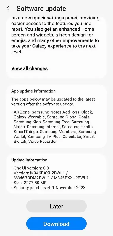 Die neue Software-Version wurde mit der Build-Nummer M346BXXUBUBWL1 veröffentlicht. Das System wiegt 2,27 GB und wurde bereits von den Besitzern des Geräts in Indien empfangen. In anderen Ländern wird das OTA-Update in Kürze erscheinen.