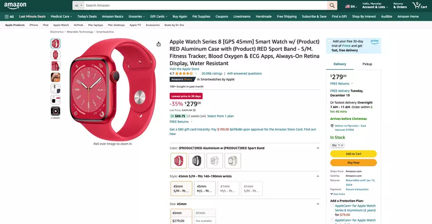 Es handelt sich um die Apple Watch Series 8 Smartwatch mit einem 45 mm Gehäuse und in der Farbe (Product) RED. Das Gerät kann für check price on amazon gekauft werden.