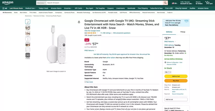 Chromecast mit Google TV (4K) ist bei Amazon mit einem Rabatt von $12 erhältlich