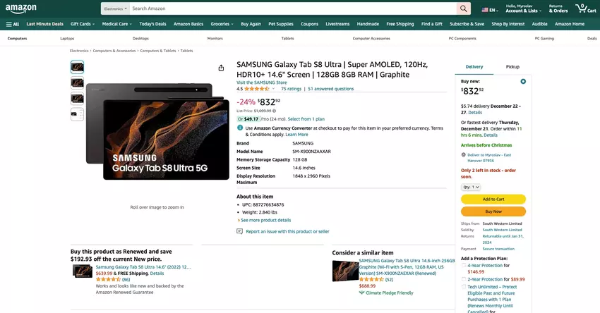 Die gg-Redaktion hat ein weiteres tolles Angebot für Sie auf Amazon gefunden - Samsung Galaxy Tab S8 Ultra für $999.99 $1,099.99, -9%.