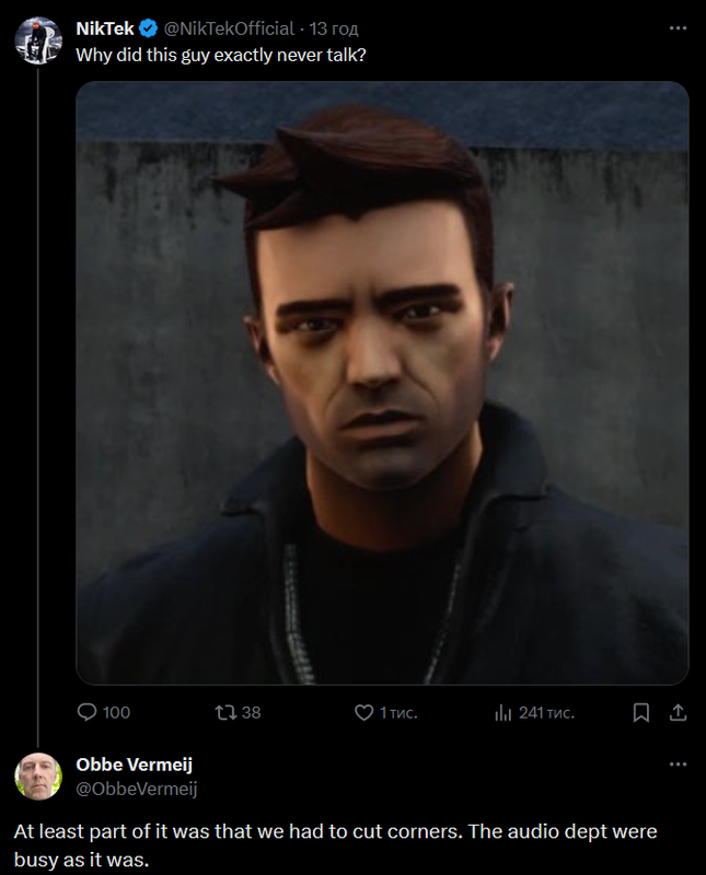 Obbe Vermeij, ein ehemaliger Rockstar-Entwickler, der an der Entwicklung von GTA III beteiligt war, sagte, dass der Grund dafür sehr einfach ist. Die Audioabteilung war während der Entwicklung ausgelastet, also entschied man sich, nicht noch mehr Arbeit hineinzustecken, sondern die Figur stumm zu machen.