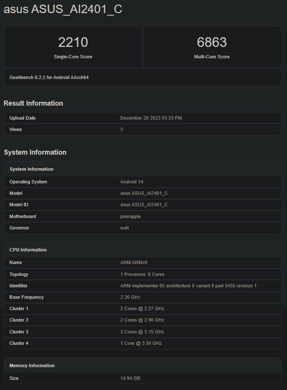 Das Gerät trägt die Modellnummer AI2401_C. Dem Bericht zufolge wird die Neuheit mit dem neuen Top-End-Prozessor Snapdragon 8 Gen 3 ausgestattet sein. Außerdem wird das Gerät mit 16 GB RAM und dem Betriebssystem Android 14 ausgeliefert. Im Single-Core-Leistungstest erreicht das Smartphone 2210 Punkte, während es im Multi-Core-Test 6863 Punkte erreicht.