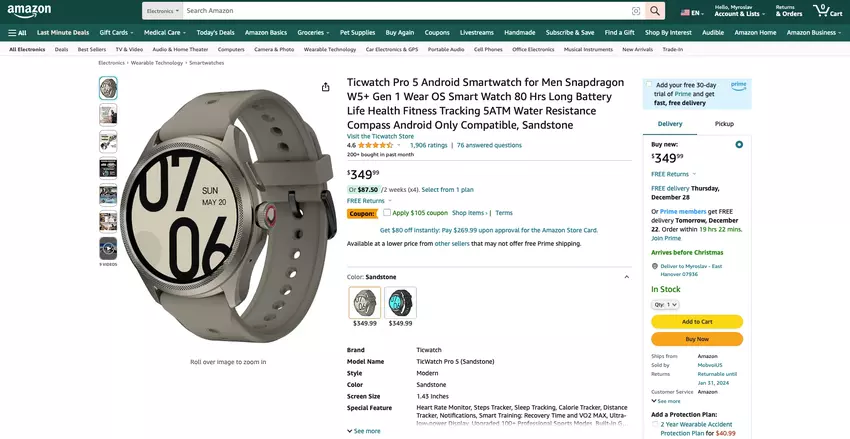 Die Uhr kostet $139.50 $349.99, -60%. Aber mit einem Gutschein des Verkäufers können Sie sie mit einem Rabatt von 105 $ kaufen. Es sind zwei Farben erhältlich: Schwarz und Sandstein.