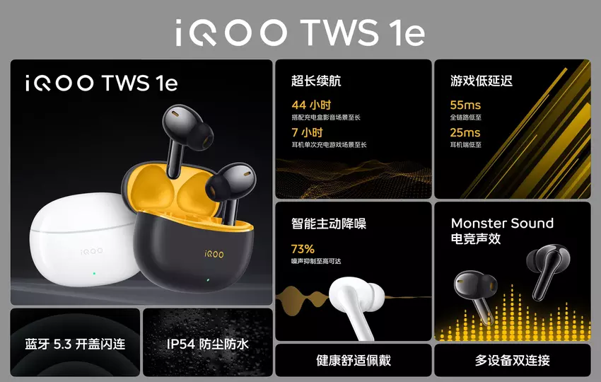 Die erste Neuheit - Kopfhörer iQOO TWS 1e. Das Modell erhielt eine Vakuum-Konstruktion, Design im Stil der AirPods Pro und schwarz und gelb Körper. Das Gerät ist mit Bluetooth 5.3, sowie DeepX 3.0 Stereo und 3D Panoramic Audio Technologien ausgestattet. Die Neuheit unterstützt aktive Geräuschunterdrückung sowie einen Gaming-Modus mit einer Verzögerung von bis zu 55 ms. Der iQOO TWS 1e hält mit einer einzigen Ladung bis zu 11 Stunden durch. Mit der Hülle wird die Akkulaufzeit auf bis zu 44 Stunden verlängert. Das Gerät wird über den USB-C-Anschluss aufgeladen.