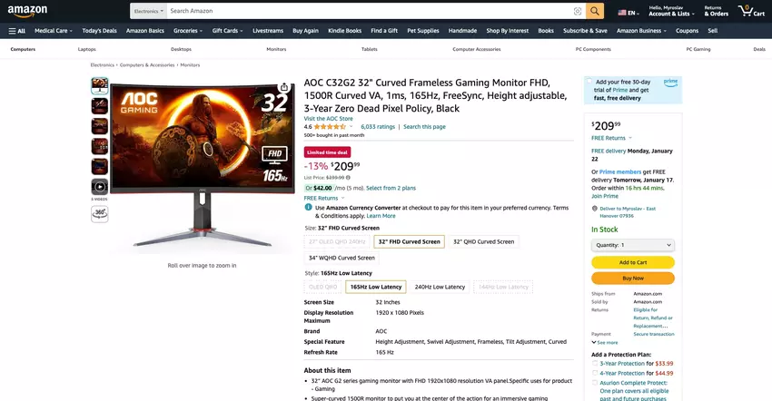 AOC C32G2 auf Amazon: 32-Zoll 165Hz Curved Monitor mit $30 Rabatt