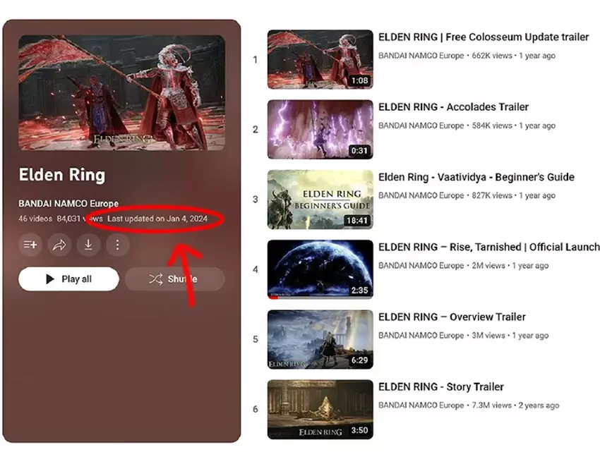 Online-Nutzer haben entdeckt, dass mehrere YouTube-Kanäle von Bandai Namco ihre Wiedergabelisten mit Trailern zu Elden Ring aktualisiert haben, obwohl in letzter Zeit keine Videos veröffentlicht wurden.