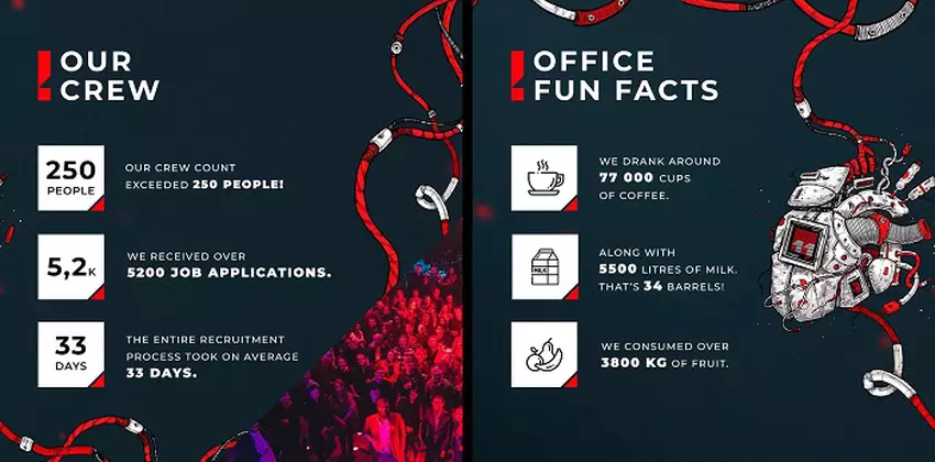 11 bit studios veröffentlichte auch einige lustige "interne" Statistiken. So tranken 250 Mitarbeiter des Studios im Laufe des Jahres 77 Tausend Tassen Kaffee mit 5500 Litern Milch und aßen mehr als 3800 Kilogramm Obst.