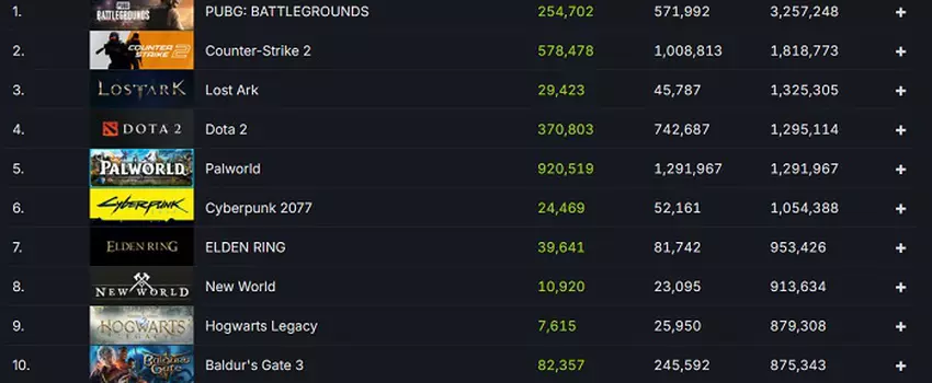 Es gab nur fünf Spiele, die 1 Million gleichzeitige Spieler auf Steam verzeichneten: PUBG, Counter-Strike 2, Lost Ark, Dota 2 und Cyberpunk 2077. Alle Spiele mit Ausnahme von Cyberpunk 2077 sind bedingt kostenlos, was einer der Hauptfaktoren ist, um eine große Anzahl von Nutzern anzuziehen.