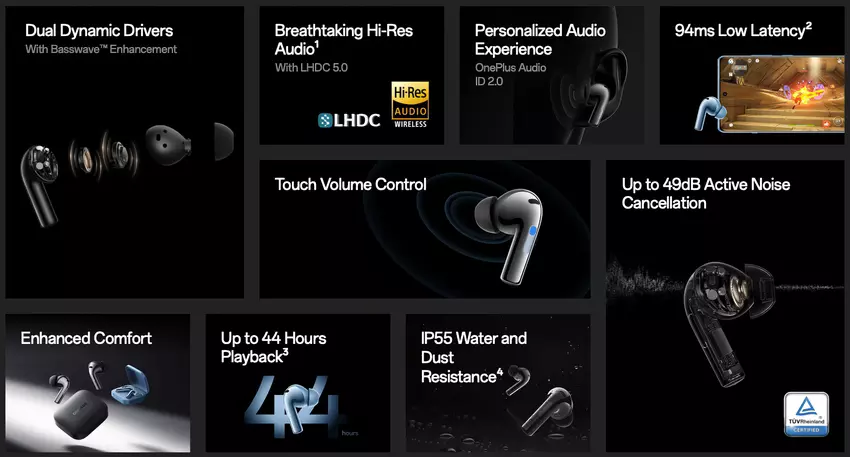 Das Modell verfügt über ein aktives Geräuschunterdrückungssystem, das Geräusche bis zu 49 dB dämpft. Das Gerät unterstützt außerdem den LHDC 5.0 Codec mit Hi-Res Audio Wireless und Spatial Audio Surround Sound Technologie mit Dolby Atmos. Die OnePlus Buds 3 verfügen über einen Gaming-Modus und Bluetooth 5.3. Die Neuheit hat IP55 Wasserschutz. Was die Akkulaufzeit betrifft, so hält sie bis zu 44 Stunden. Das Gehäuse wird über den USB-C-Anschluss aufgeladen.
