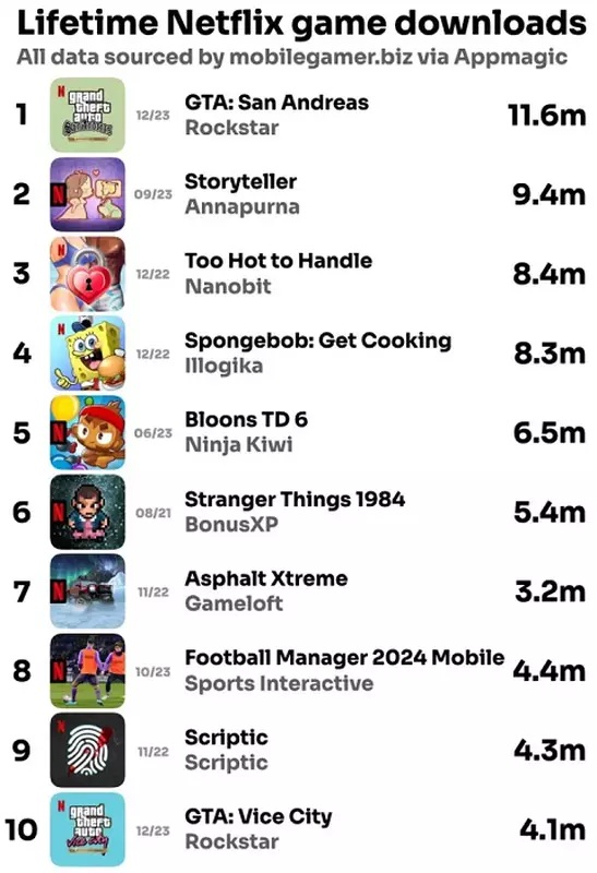 Im Finanzbericht für 2023 berichtet Netflix, dass Android- und iOS-Nutzer dank der Veröffentlichung aktualisierter Versionen von Kult-Krimi-Actionfilmen viel aktiver in Netflix Games geworden sind. Während also im November 2023 die monatliche Zahl der Spiele-Downloads auf Netflix bei rund 10 Millionen lag, stieg sie im Dezember 2023 auf 28 Millionen!