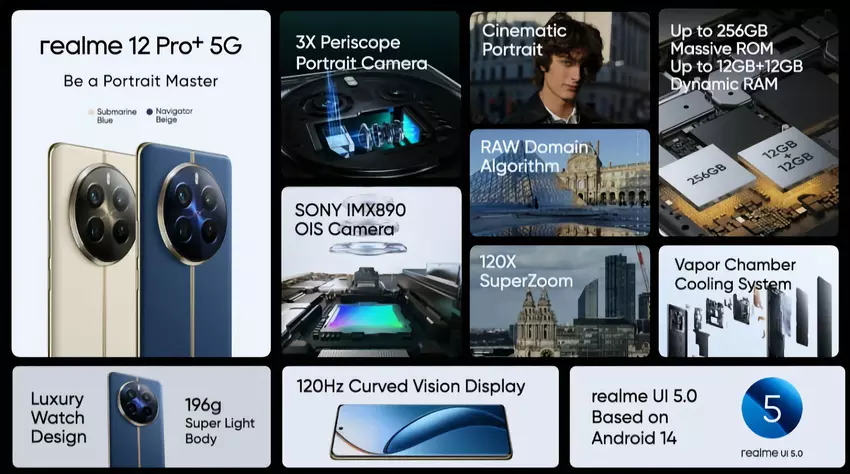 Das realme 12 Pro+ wird von einem Snapdragon 7s Gen 2 Prozessor angetrieben, gepaart mit 8/12GB RAM und 128/256GB Speicher. Das Gerät verfügt über einen 5.000-mAh-Akku, eine 67-W-Ladestation, einen Unter-Bildschirm-Scanner und Stereo-Lautsprecher mit Dolby Atmos. Das Gerät verfügt über vier Kameras: eine Frontkamera mit 32 MP und eine dreifache Hauptkamera mit 50 MP (Sony IMX890 mit OIS) + 64 MP (OmniVision OV64B Periskop mit 3x) und Ultra-Weitwinkelobjektiv mit 8 MP. Das Smartphone kommt mit Android 14 Betriebssystem und realme UI 5.0 Hülle.