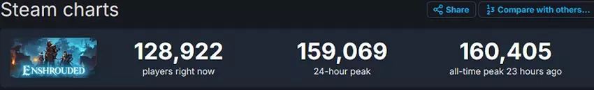 Laut dem Dienst SteamDB erreichte Enshrouded einen Online-Spitzenwert von 160 Tausend Spielern mit mehr als 90 % positivem Feedback. Natürlich kann man es nicht mit Palworld vergleichen, aber dennoch hat Enshrouded eine großartige Leistung und ein riesiges Potenzial.