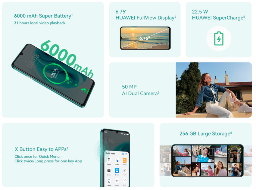 Das Huawei Nova Y72 ist die globale Version des Huawei Enjoy 70. Das Smartphone hat ein 6,75-Zoll-LCD-Display, einen Kirin 710A-Prozessor und einen 6000-mAh-Akku. Das Gerät unterstützt 22,5 W Aufladung. Die Neuheit hat eine Dual 50 MP + 2 MP Hauptkamera und eine 8 MP Frontkamera. Das Smartphone verfügt über eine X-Key-Taste am linken Rand. Sie kann mit verschiedenen Aktionen belegt werden.