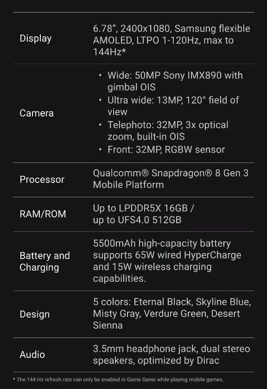 Das Display wird eine AMOLED-LTPO-Matrix mit 6,78 Zoll und einer Bildwiederholrate von bis zu 144 Hz erhalten. Angetrieben wird die Neuheit von einem Snapdragon 8 Gen 3 Prozessor, gepaart mit bis zu 16 GB LPDDR5X RAM und bis zu 512 GB UFS 4.0 Speicher. Das Gerät wird mit einer 50 MP Hauptkamera (Sony IMX890 c OIS) + 13 MP (Weitwinkelobjektiv) + 32 MP (Teleobjektiv mit OIS) und einer 32 MP Frontkamera ausgestattet sein. Das ASUS Zenfone 11 Ultra wird von einem 5500mAh-Akku angetrieben. Das Gerät wird mit 65 W kabelgebundenem und 15 W kabellosem Laden ausgestattet sein. Das Smartphone wird einen 3,5-mm-Klinkenanschluss sowie Stereolautsprecher haben.
