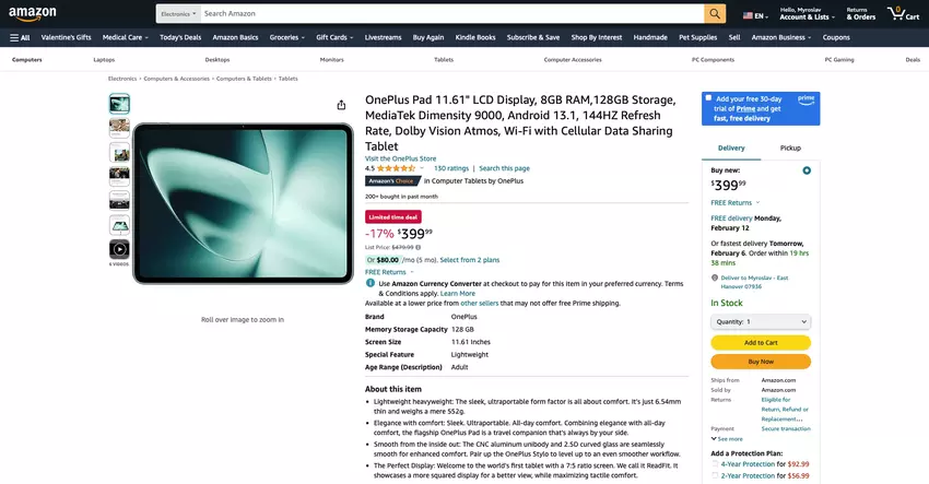 Das OnePlus Pad ist jetzt auf Amazon für weniger als $382.25 erhältlich $382.25 Es ist in einer Farbe und einer Speichervariante - 8/128 GB - erhältlich.