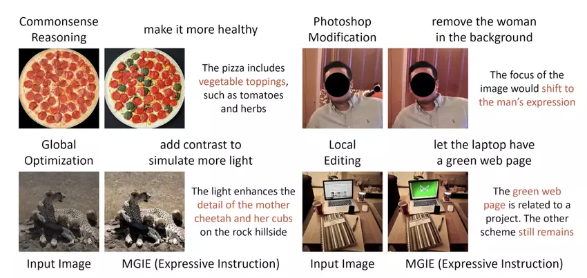 MGIE nutzt die Technologie der multimodalen Modelle großer Sprachen. Damit ist es möglich, kurze und mehrdeutige Benutzerbefehle zu interpretieren, um Fotos weiter zu bearbeiten. So kann die KI beispielsweise die Aufforderung "Gesünder machen" für ein Pizzafoto als Aufforderung zum Hinzufügen von pflanzlichen Zutaten verstehen.