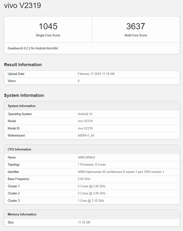 Wir sprechen über das Modell vivo V30 Pro. Gadget mit der Modellnummer V2319 bemerkt in der Geekbench-Datenbank. Dem Bericht zufolge wird das Smartphone MeidaTek Dimensity 8200 Prozessor laufen. Darüber hinaus wird die Neuheit 12 GB RAM und Android 14-Betriebssystem out of the box bekommen.