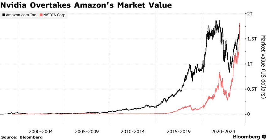 Das letzte Mal, dass Nvidia mehr wert war als Amazon, war 2002, als beide weniger als 6 Milliarden Dollar wert waren.