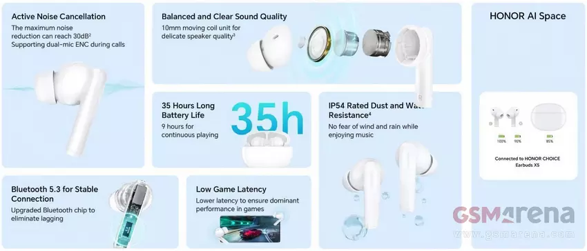 Das Modell wurde Honor Choice Earbuds X5 genannt. Das Gerät verfügt über eine Vakuumkonstruktion und 10-mm-Treiber. Die Kopfhörer verfügen über ein aktives Geräuschunterdrückungssystem sowie einen Gaming-Modus mit minimaler Latenz. Die Neuheit lässt sich über Bluetooth 5.3 mit Smartphones, Tablets und Computern verbinden. Honor Choice Earbuds X5 hat IP54 Schutz. Die Akkulaufzeit beträgt bis zu 9 Stunden. Mit dem Ladecase erhöht sich diese Zeit auf 35 Stunden. Das Gehäuse wird über den USB-C-Anschluss aufgeladen.