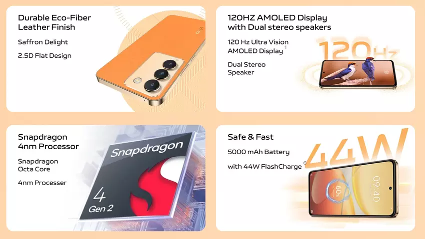 Die vivo Y200e 5G hat IP54 Wasser und Staub Widerstand. Das Smartphone wird von einem Snapdragon 4 Gen 2 Prozessor angetrieben, der mit 6/8 GB RAM gepaart ist. Das Gerät verfügt außerdem über einen 5000-mAh-Akku mit 44 W Ladeleistung, ein 5G-Modem, Stereolautsprecher mit Hi-Res Audio und einen USB-C-Ladeanschluss. Das Gerät kommt mit Android 14 Betriebssystem und FunTouch OS 14 Hülle.