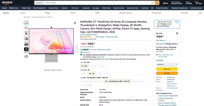 Es handelt sich um das Modell ViewFinity S9 für $1,599.99. Der Monitor verfügt über ein IPS-Panel, einen Mini PD-Anschluss und einen 90W Thunderbolt 4-Anschluss.