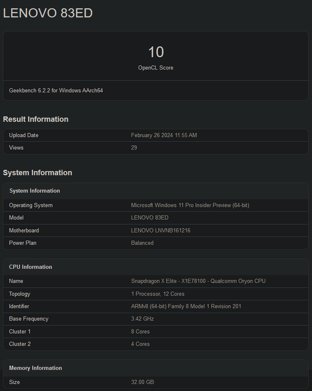 Das Lenovo-Notebook ist außerdem mit einer unbekannten Adreno-GPU ausgestattet, die in den OpenCL-Tests von Geekbench ebenfalls schlecht abschnitt und nur 10 Punkte erreichte. Das Notebook verfügt über 32 GB RAM und läuft mit der Windows 11 Pro Insider Preview.