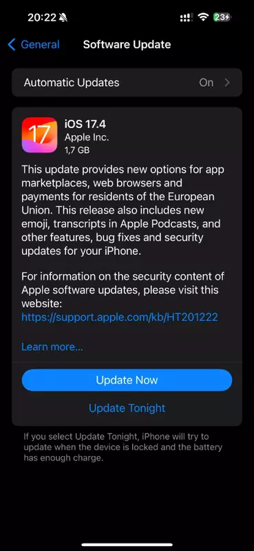 Darüber hinaus hat Apple die Veröffentlichung von Spiele-Streaming-Diensten (Xbox Cloud Gaming, Nvidia GeForce NOW usw.) im App Store erlaubt. Außerdem gibt es in iOS 17.4 neue Emoji, Podcast-Transkripte, einen leicht aktualisierten Safari-Browser, erweiterte Einstellungen für Stolen Device Protectio und vieles mehr. Außerdem haben die Entwickler eine Reihe von Fehlern im System behoben.