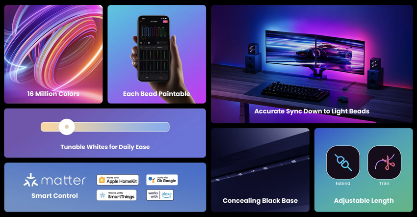 Es handelt sich um den Obsid RGBIC LED Light Strip. Es hat ein Design mit der Möglichkeit der Erweiterung. Die Neuheit kann mit verschiedenen Hubs für Smart Home verbunden und per Sprache gesteuert werden. Das Gerät unterstützt das Matter-Protokoll.