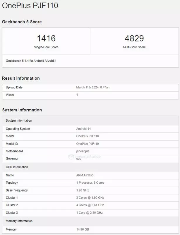 Es handelt sich um das OnePlus Ace 3V mit der Modellnummer PJF110. Dem Bericht zufolge wird das Gerät von einem Acht-Kern-Prozessor angetrieben werden. Das Modell des Chips Geekbench nicht offen zu legen, aber die Beurteilung durch die Merkmale der Kerne, ist es die neue SoC Snapdragon 7 + Gen 3. Es wird sein Debüt auf dem 18. März machen.