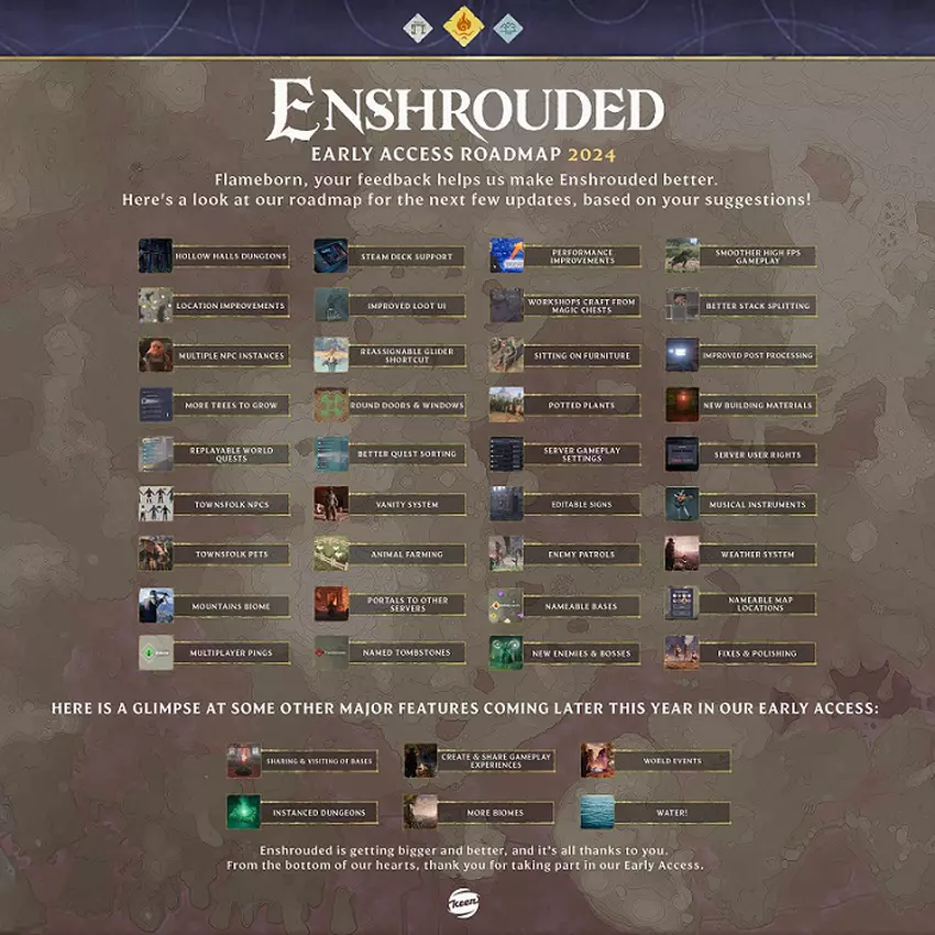 Im Jahr 2024 soll Enshrouded viele neue Features, Mechaniken, Gegner und vieles mehr haben. Die Entwickler betonten, dass viele ihrer Ideen den Wünschen der Spieler entsprechen, so dass sie von der Richtigkeit ihres Vorgehens überzeugt sind.