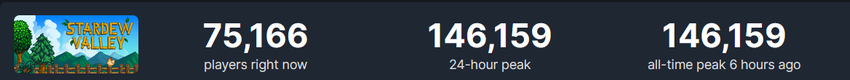 Mit dem Update wurde die Online-Spitze des Spiels auf 146 Tausend Spieler auf dem PC erhöht. Und zum Zeitpunkt der Erstellung dieses Artikels spielen 75 Tausend Spieler gleichzeitig Stardew Valley.