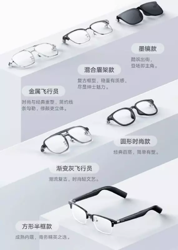 Das Modell wurde MiJia Smart Audio Glasses genannt. Die Neuheit erhielt sechs verschiedene Rahmen und Technologie der Luftleitung von Ton. Im Inneren der Brille befinden sich Ultraschall-Lautsprecher, die einen Algorithmus für die Synthese von Tonhöhlen verwenden. Die Neuheit verfügt über ein System zur Rauschunterdrückung bei Gesprächen sowie über spezielle Sensoren, die die Position des Geräts erkennen. Nimmt man zum Beispiel die Brille ab, wird die Musik automatisch unterbrochen.