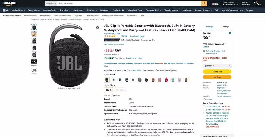 Es handelt sich um den kabellosen Lautsprecher JBL Clip 4 für $49.95 $64.95, -23%. Es sind viele verschiedene Farben erhältlich.