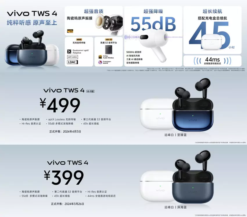 vivo TWS 4: ANC, aptX Lossless Unterstützung, Qualcomm S3 Gen 3 Chip, Bluetooth 5.4, bis zu 45 Stunden Akkulaufzeit und ein Preis ab $55
