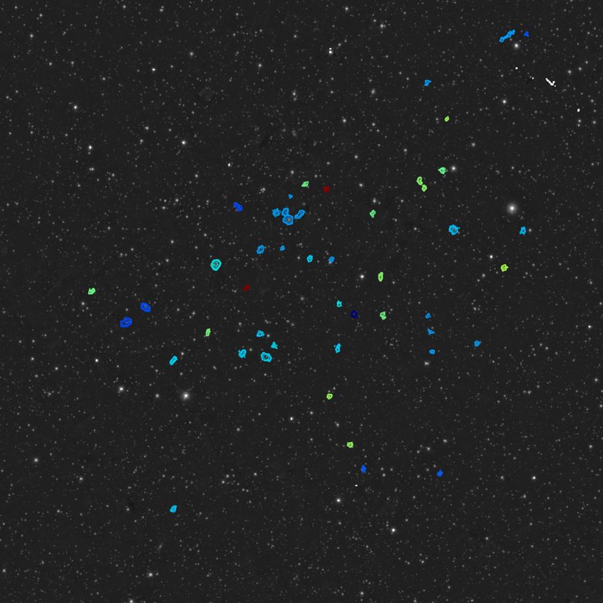 Die 49 neuen Galaxien, die vom MeerKAT-Radioteleskop in Südafrika entdeckt wurden, sind als farbige Konturen dargestellt: rötliche Farben stehen für weiter entferntes Gas, blaue Farben für näheres Gas