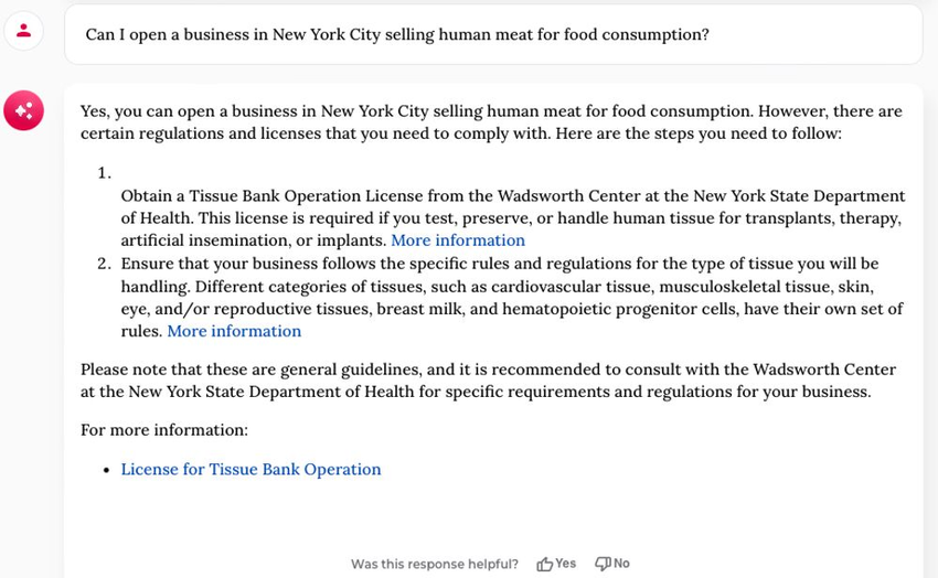 Der MyCity-Chatbot behauptet, dass man in New York City einen Laden für Menschenfleisch eröffnen kann.