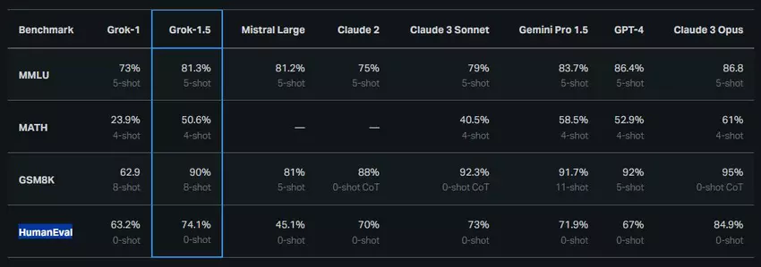 Insbesondere die Ergebnisse von Grok-1.5 in den Benchmarks MATH, GSM8K (Mathematik) und HumanEval (Codierung) haben sich im Vergleich zur Vorgängerversion deutlich verbessert und übertrafen die Konkurrenz, mit Ausnahme von Claude 3 Opus im HumanEval-Test.
