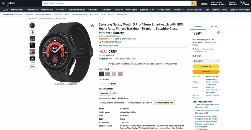 Samsung Galaxy Watch 5 Pro mit 45-mm-Titangehäuse und Saphirglas ist auf Amazon mit einem Rabatt von bis zu 192 $ erhältlich
