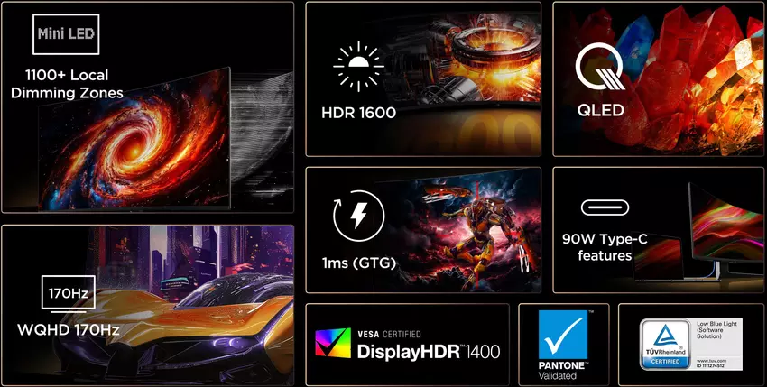 Der neue Monitor von TCL ist ebenfalls Pantone-getestet und werkseitig kalibriert, um eine genaue Farbwiedergabe zu gewährleisten. Mit 1152 Mini-LED-Backlight-Zonen erreicht der Monitor eine HDR-Spitzenhelligkeit von 1600 nits und erhält die VESA DisplayHDR 1400-Zertifizierung.