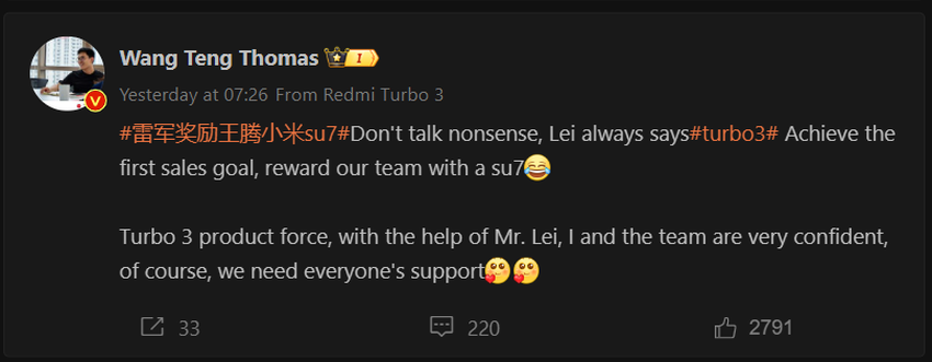 Am selben Tag kündigte Lei Jun an, dass er die SU7 dem Redmi CEO Wang Teng Thomas schenken würde, wenn das erste Verkaufsziel des neuen Redmi Turbo 3 Telefons erreicht wird. Diese Ankündigung erfolgte kurz nachdem Redmi offiziell den 10. April als Starttermin für das Turbo 3 bekannt gegeben hatte.