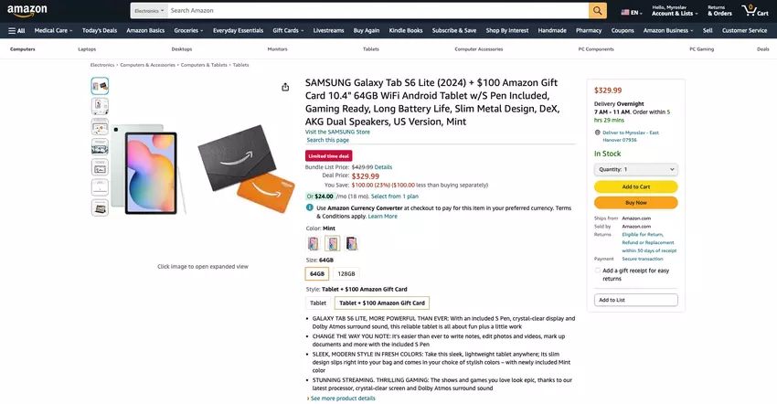 Amazon schenkt eine 100-Dollar-Geschenkkarte beim Kauf eines Samsung Galaxy Tab S6 Lite (2024) Tablets