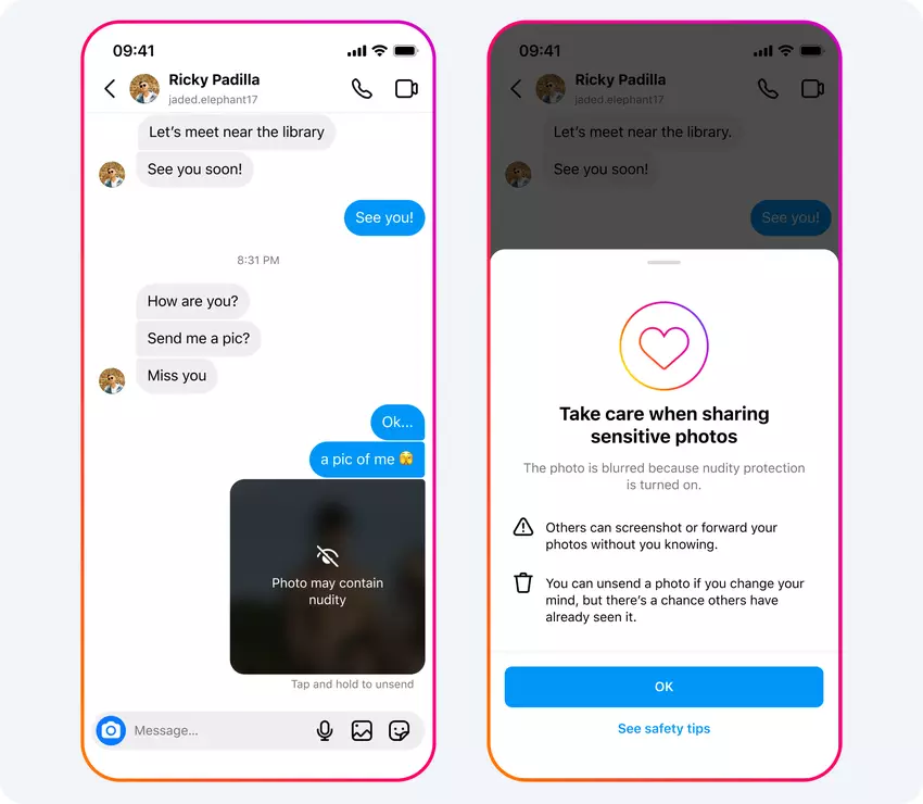 Nach Angaben des FBI sind die Hauptopfer solcher Angriffe männliche Teenager im Alter zwischen 14 und 17 Jahren. Laut der Behörde gibt es eine "alarmierende Rate von Selbstmorden" unter männlichen Opfern von finanzieller Sex-Erpressung. Das Unternehmen erklärte, dass es eine Technologie einsetzt, um Nutzer zu identifizieren, die möglicherweise an sexueller Erpressung beteiligt sind. Die privaten Nachrichten von Instagram werden bald über eine "Nacktheitsschutz"-Funktion verfügen, die automatisch intime Fotos unkenntlich macht, die von Teenagern unter 18 Jahren gesendet und empfangen werden. So können die Nutzer intime Fotos, die sie verschickt haben, widerrufen und entscheiden, ob sie ein Nacktfoto sehen wollen, das ihnen geschickt wurde.