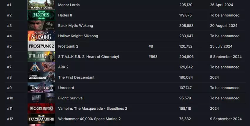 Diese Zahl übertrifft so erwartete Projekte wie Hades II, Black Myth: Wukong, Hollow Knight: Silksong, Frostpunk 2 und S.T.A.L.K.E.R. 2: Heart of Chornobyl.